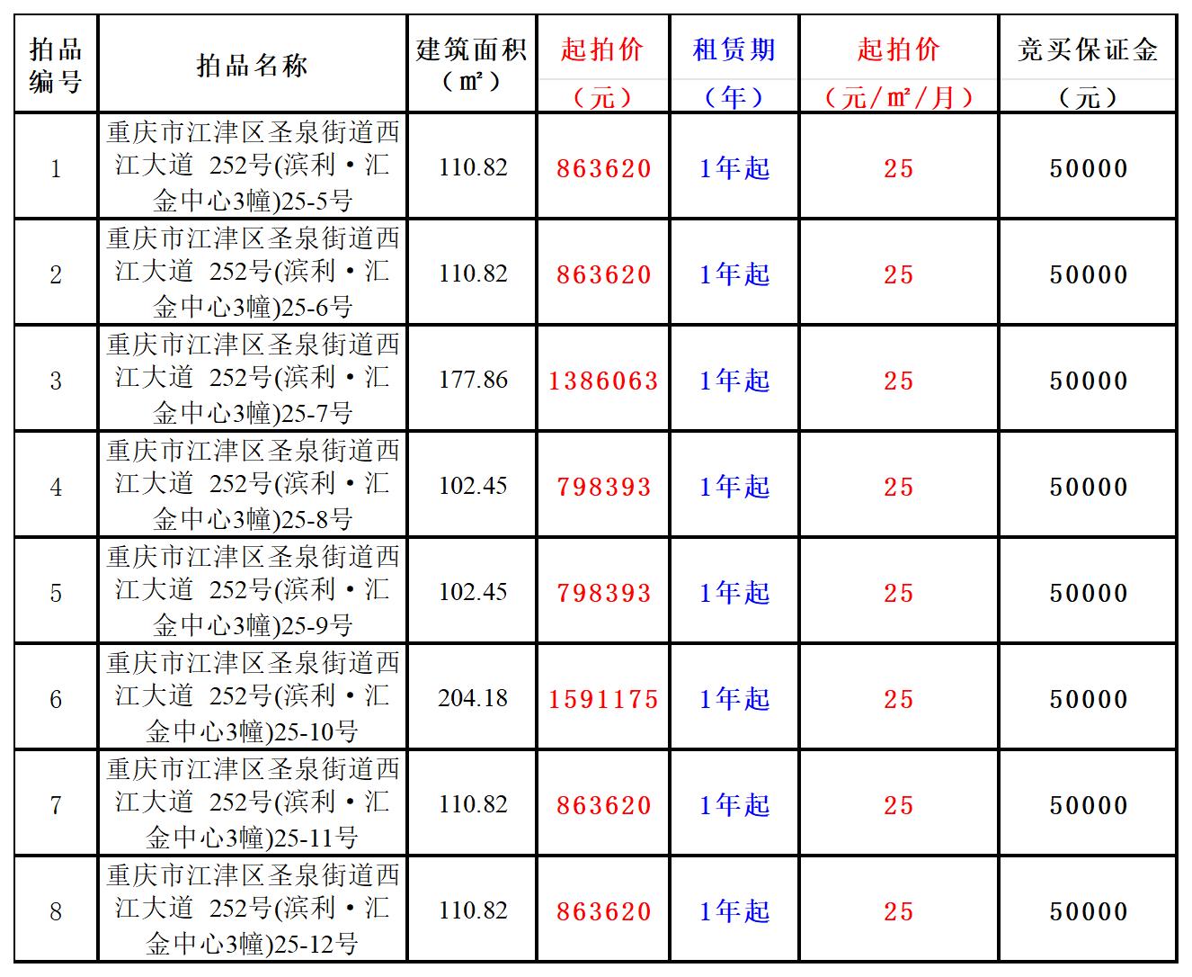 1、重慶市江津區(qū)圣泉街道西江大道 252號(濱利·匯金中心3幢) 25 層辦公用房8間,建筑面積:102.45㎡-204.18㎡,起拍價:798393元-1591175元,競買保證金:5萬元/間;租賃權(quán)起拍價:25元/㎡/月/間。