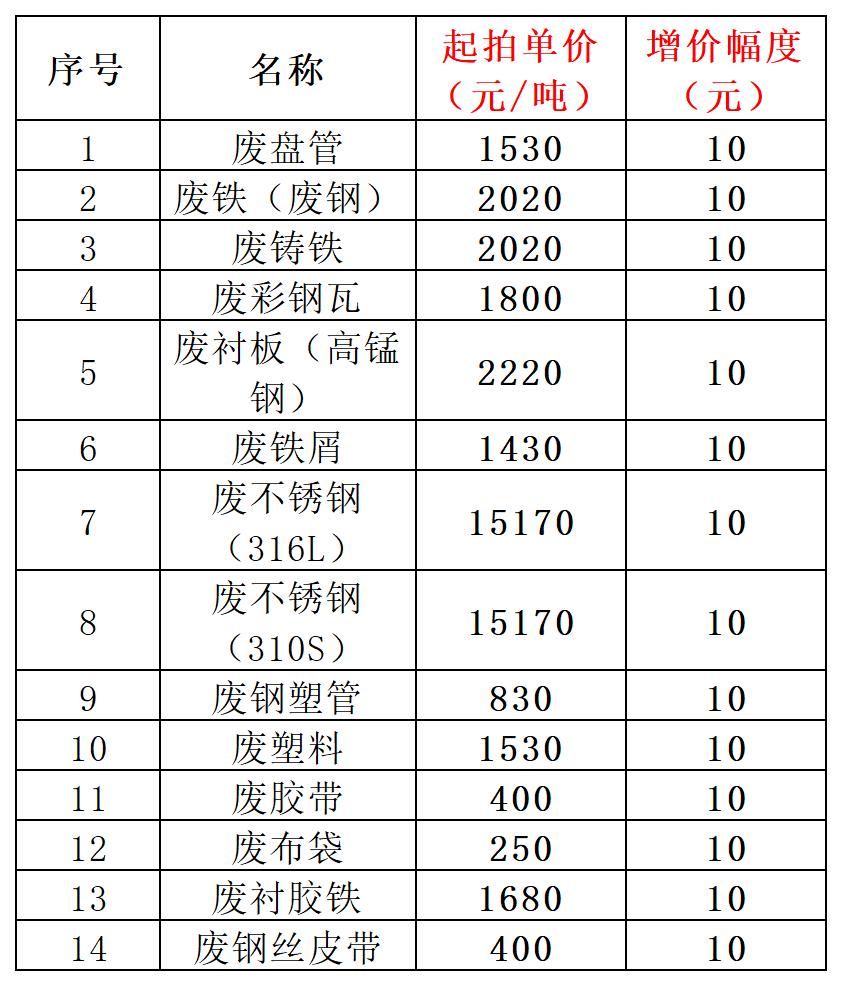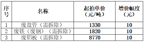 該標(biāo)的為整體拍賣(mài),以第1項(xiàng)廢盤(pán)管(需拆除)起拍單價(jià)1330元/噸進(jìn)行競(jìng)價(jià),采取增價(jià)方式競(jìng)拍,每次每噸加價(jià)10元,上不封頂;廢盤(pán)管(需拆除)每增加10元/噸,第2、3項(xiàng)廢舊物資同步增加10元/噸。
