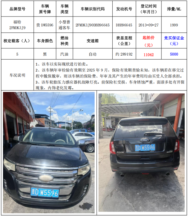 2、福特2FMDK3J9小型普通客車1輛,起拍價:11042元,競買保證金:5000元。
