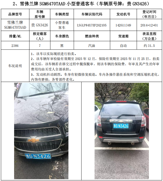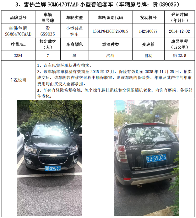 3、別克牌SGM6521ATA小型普通客車1輛、雪佛蘭牌SGM6470TAAD小型普通客車2輛,共計(jì)3輛,整體拍賣,起拍價:28600元,競買保證金:5000元。