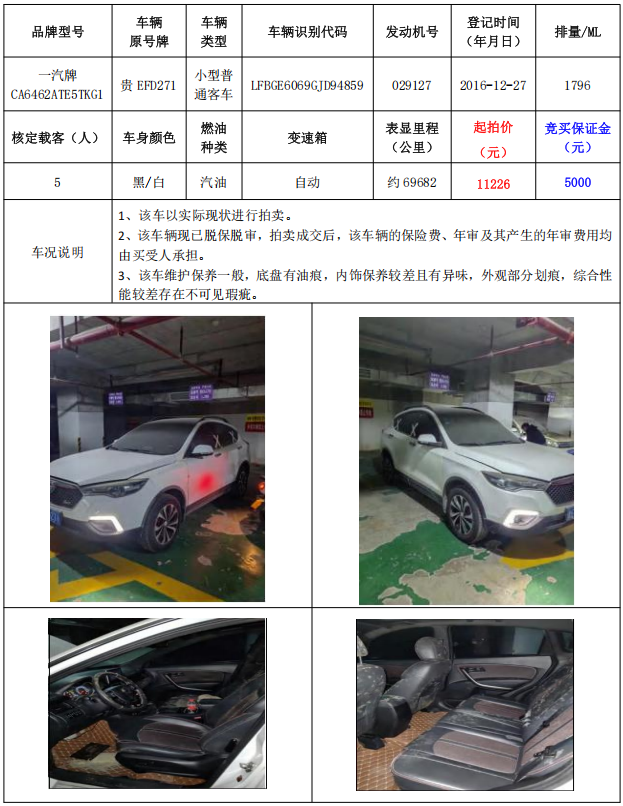 拍品編號1:一汽牌CA6462ATE5TKG1小型普通客車1輛(車輛原號牌:貴EFD271)
