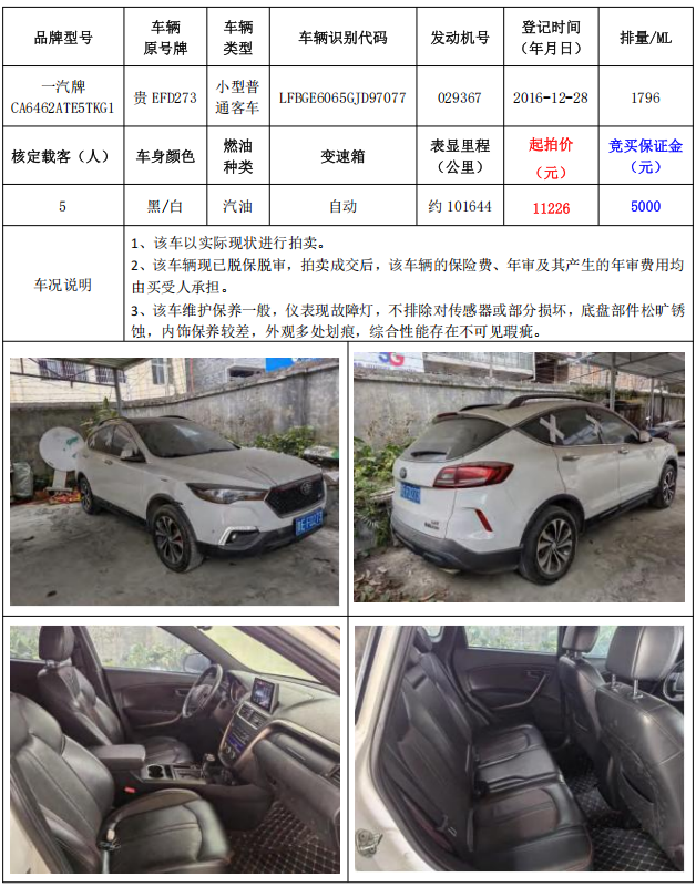 拍品編號3:一汽牌CA6462ATE5TKG1小型普通客車1輛(車輛原號牌:貴EFD273)