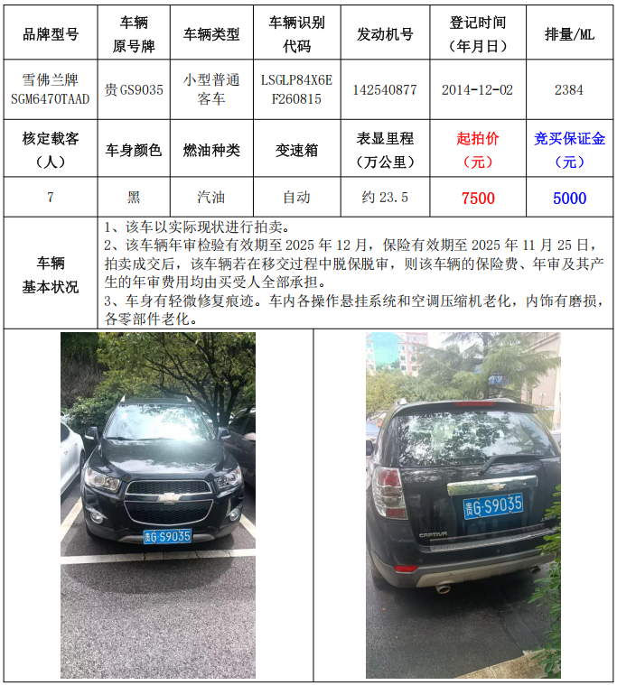 拍品編號(hào)1:雪佛蘭牌SGM6470TAAD小型普通客車(車輛原號(hào)牌:貴GN3426)