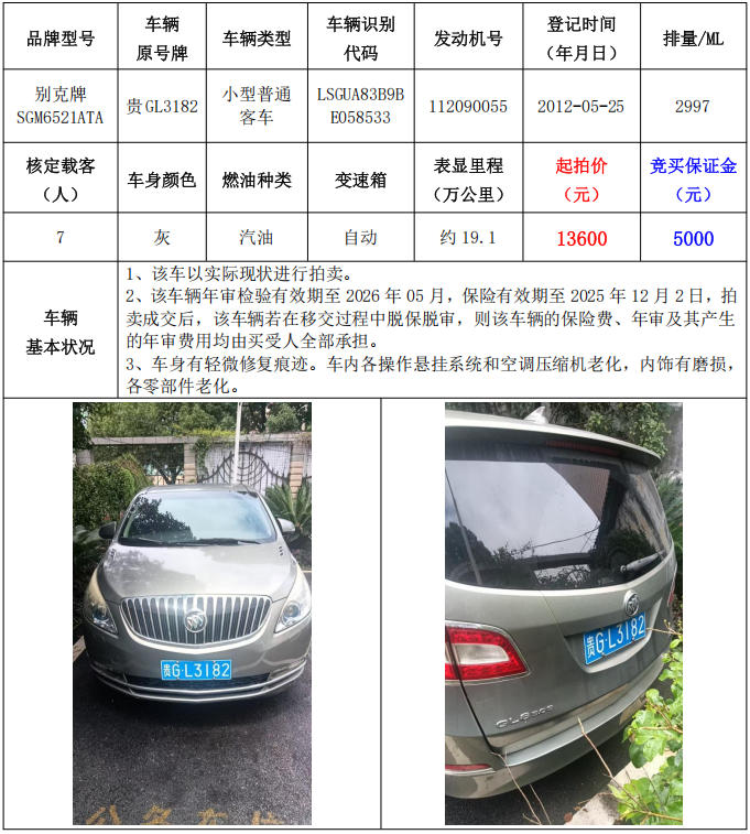 拍品編號(hào)3:別克牌SGM6521ATA小型普通客車(車輛原號(hào)牌:貴GL3182)