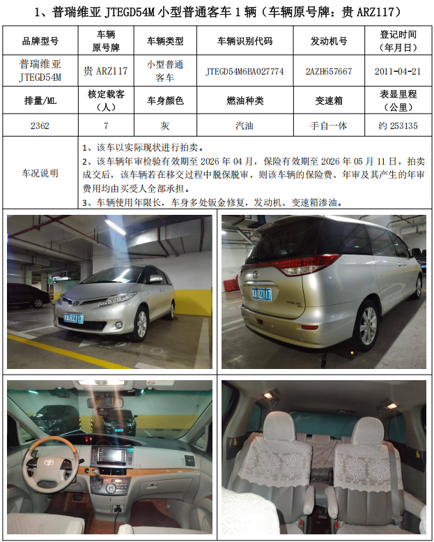 拍品編號(hào)1:普瑞維亞小型普通客車1輛、奧迪牌小型轎車2輛、昂科雷小型越野客車2輛,共計(jì)5輛,整體拍賣