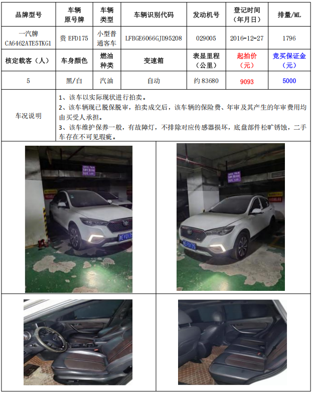 拍品編號(hào)3:一汽牌CA6462ATE5TKG1小型普通客車1輛(車輛原號(hào)牌:貴EFD273)