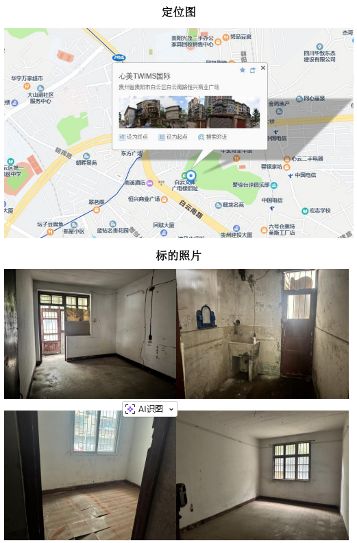 標(biāo)的坐落于白云區(qū)白云南路50號1單元1層2號,房屋總層數(shù)為4層,拍賣標(biāo)的所在層數(shù)為1層,產(chǎn)權(quán)證編號:黔(2025)白云區(qū)不動產(chǎn)權(quán)第0005922號,權(quán)利類型:國有建設(shè)用地使用權(quán)/房屋所有權(quán),權(quán)利性質(zhì):劃撥/自建房,用途:城鎮(zhèn)住宅用地/成套住宅,建筑面積:54.5㎡,房屋結(jié)構(gòu):混合結(jié)構(gòu)。