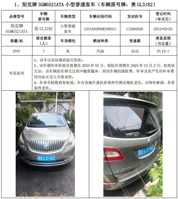 3、別克牌SGM6521ATA小型普通客車1輛、雪佛蘭牌SGM6470TAAD小型普通客車2輛,共計(jì)3輛,整體拍賣,起拍價(jià):28600元,競(jìng)買保證金:5000元。