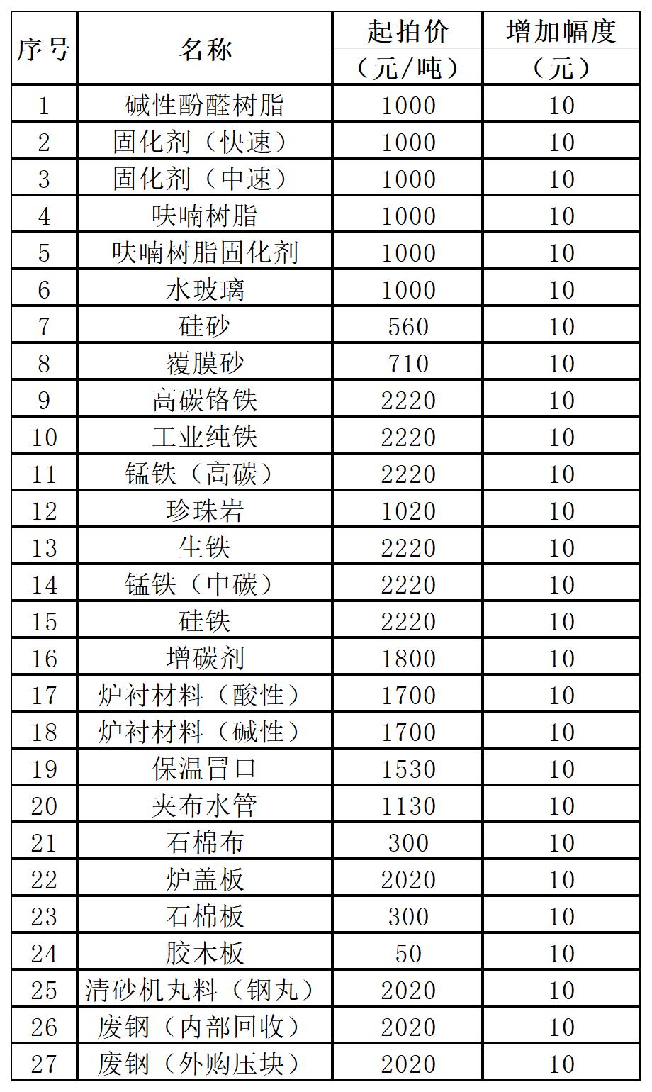 該標(biāo)的為整體拍賣(mài),以第1項(xiàng)堿性酚醛樹(shù)脂起拍單價(jià)1000元/噸進(jìn)行競(jìng)價(jià),采取增價(jià)方式競(jìng)拍,每次每噸加價(jià)10元,上不封頂;堿性酚醛樹(shù)脂每增加10元/噸,第2-27項(xiàng)廢舊原材料同步增加10元/噸。