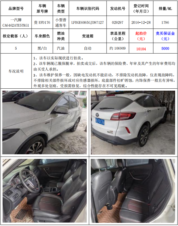 拍品編號(hào)5:一汽牌CA6462ATE5TKG1小型普通客車1輛(車輛原號(hào)牌:貴EFD176)