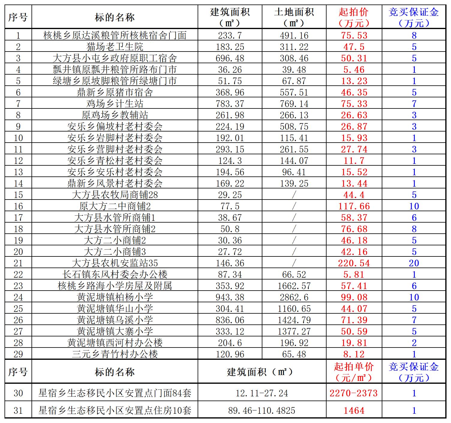 【12月17日】大方縣城、核桃鄉(xiāng)、貓場鎮(zhèn)、瓢井鎮(zhèn)、綠塘鄉(xiāng)、鼎新鄉(xiāng)、安樂鄉(xiāng)、長石鎮(zhèn)、雞場鄉(xiāng)、三元鄉(xiāng)、黃泥塘鎮(zhèn)、星宿鄉(xiāng)房地產(chǎn)拍賣公告